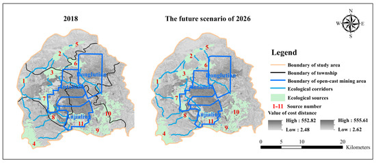 As shown in Figure 7, from the ecological resistance surface in 2018, the areas of high ecological resistance coefficient were distributed in the areas around the three open-cast mines, and the ecological resistance coefficient decreased moving away from the open-cast mines. This phenomenon was related to the high-intensity human interference activities and the land cover changes of the open-cast mines. In order to predict the future scenarios of ecological risk, we constructed ecological resistance surfaces for 2026 based on land-use change simulation. From the spatial pattern of the ecological resistance surfaces, the most obvious changes are in the three open-pit mining areas and their surrounding areas. The area east of the open-cast mining area would increase as a newly developed mining area, while the Antaibao and Anjialing mining area would decrease due to land reclamation, which would result in a reduction in ecological risk in the eastern Anjialing open-cast mining area and an increase in ecological risk around the Donglutian open-cast mining area.