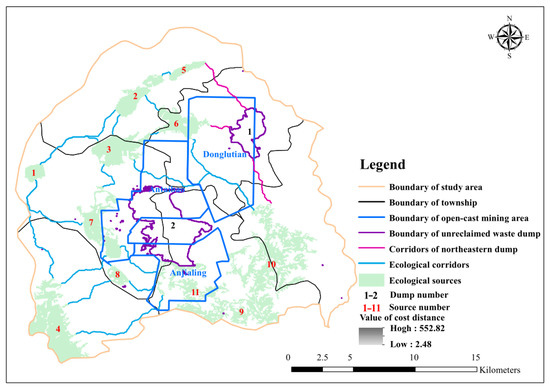 As shown in Figure 6, a total of 11 ecological sources were identified in this the study area. The largest ecological source was source 10, which was located in the southeastern study area with an area of 20.80 km2. The smallest ecological source was source 7, which was the reclamation land from a waste dump with an area of 1.52 km2. From the perspective of the administration region, the Taocun Township had the largest area of ecological sources (20.82 km2), while the Yuling Township had the smallest area of ecological sources with an area of 4.85 km2. As shown in Figure 6, the Donglutian open-cast mine was mainly located in the Yuling Township, covering most of the town. The construction of the Donglutian mine was initiated in 2009, and a large amount of ecological land was damaged in the initial construction phase. Although small-scale ecological restoration projects exist, it was difficult to form new ecological sources in a short period of time. Jingping Township had the most ecological source patches, the total area of which was 17.33 km2. Furthermore, the area of source in Baitang Township, Xiamiangao Township, and Xiangyangbao Township were 13.01 km2, 10.49 km2 and 7.94 km2, respectively.