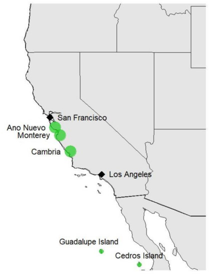 Radiata pine occurs naturally in five locations (provenances): Año Nuevo (CA, USA), Monterey (CA, USA), Cambria (CA, USA), Cedros Island (Mexico), and Guadalupe Island (Mexico, Figure 1). The species was first introduced to New Zealand ca. 170 years ago and has shown excellent growth under the local environmental conditions. Populations of ca. 1000 individuals were collected from forest stands across New Zealand during 1950–1988. This included trees from all five provenances growing in provenance tests established in New Zealand. Several sublines were established targeting different traits such as growth and form, wood density, Dothistroma needle blight resistance, and internode length. However, after the most recent revision of the breeding programme, a nucleus breeding strategy was proposed [27]. This strategy featured a large open-pollinated main population and a smaller elite population, with 50% of testing via progeny tests and 50% via clonal tests. Overall, more than 400,000 trees have been grown and measured in more than 100 replicated field trials.