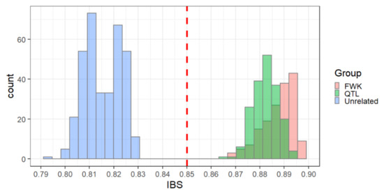 Distribution of identity-by-state (IBS) similarity coefficients within and across families. IBS coefficients between parents and their offspring are shown in green (“QTL” family) and red (“FWK” family). IBS coefficients for unrelated trees in the “QTL” versus “FWK” families are shown in blue. An empirical threshold between unrelated and related trees was set at IBS = 0.85 (red line).