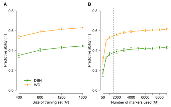Genomic predictive abilities for diameter at breast height (DBH) and wood density (WD) as a function of training set size (A) and number of markers (B) used in random cross-validations of 1761 radiata pine genotypes from five populations (Table 1). Error bars correspond to standard deviations across 100 random cross-validations for each set of parameters. Analyses in (A) were based on all 9353 markers. The training set size in (B) was N = 1200 and subsets of markers were selected at random. Predictive abilities were calculated based on the predicted and observed values of all 1761 genotypes, after data had been split randomly into k folds until a predicted value was available for each genotype (see Materials and Methods and Table 1). The dashed line in (B) indicates the plateau in predictive ability.