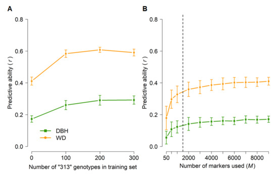 Next, we explored scenarios in which the phenotypes of specific populations were predicted from training sets that included a small subset of individuals from the same population. These scenarios were used to simulate reduced field testing. More specifically, we tested whether we could predict the phenotypes of the more advanced “313” population by training a model on the other populations and families included in GBLUP analyses. The average predictive abilities for DBH and WD were 0.17 and 0.41, respectively, when no “313” genotypes were included in the training set (Figure 5A). However, including even as few as 100 (15%) of the “313” genotypes in the training set resulted in roughly 50% higher predictive abilities, with no further improvements when 200 or 300 “313” genotypes were included in the training set. Finally, GBLUP predictions based on as few as 2000 randomly selected markers were nearly as good as those based on the whole set of 9353 markers (Figure 5B).
