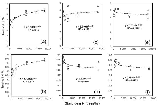 A covariation analysis revealed a significant (p < 0.050) relationship between the stand density and the soil C and N contents only under spruce; the stand density there explained 83 and 84% of the variation in the soil C and N (Figure 2), respectively. Under the other two tree species, the density explained less than 20% of the variation for either element. Both the C and N contents under spruce were related to the stand density through the power function with the exponents near to 1/8. The exponents for C were 0.13 with the upper and lowest values within 95% confidence of 0.17 and 0.10. The exponent for N was 0.125, an exact 1/8, with a 95% confidence interval between 0.09–0.15. Thus, the significant accumulation of C and N with an increasing forest stand density was observed only for spruce.
