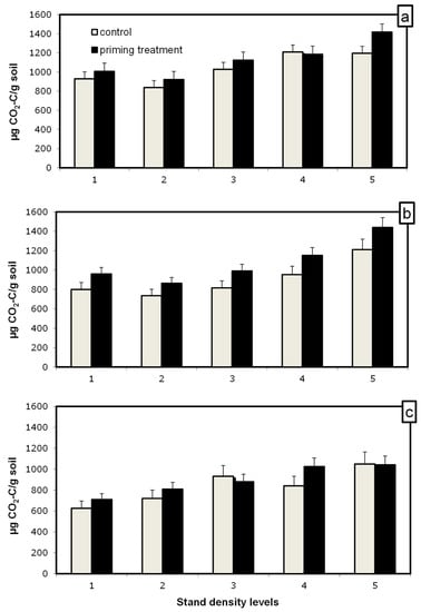 Planting trees could dilute old soil C by adding new C. Even if net changes in the soil C are small due to the mineralization of the old soil C, the addition of newly derived C from trees to the soil could cause the total soil C to be qualitatively different. This is important to SOM stability and future soil carbon losses because the response of the soil heterotrophic respiration to the altered temperature is largely determined by the quality and availability of the SOM; thus, the tree species may determine the soil CO2 flux response to the temperature increase without affecting the net C content in the soil. The susceptibility of the SOM to microbial priming (primability) might also depend on the tree species and stand density. This is potentially important because priming influences the oxidation of the old soil carbon reservoirs in deep soil. In many cases, priming has been sufficiently large to induce soil carbon losses in response to long-term CO2 enrichment, influencing the total carbon balance response of the system [,]. In these cases, the priming effect is a major modulator of the net carbon balance response. Thus, the priming effect is now acknowledged to be sufficiently large to warrant its inclusion in global models of carbon cycling [,]. Unfortunately, the controls over priming are extremely difficult to discern. In particular, the effects of plant species on soil priming are very poorly understood. The goal of this work was to discern the effects of three individual Siberian tree species and stand densities on the contents and stability of the SOM. We show here that the stand density affects the decomposability of the soil C to a greater effect than the soil C contents. This implies that the effect of stand density is important to consider even if the stand density does not affect the total soil C. Moreover, we demonstrate for the first time strong tree species effects on the primability of the soil C; this is important for predicting the soil C response to global climate change under different tree species.