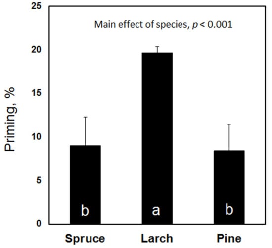 In contrast to the decomposability, the priming effect was not altered by the stand density but it was strongly affected by the tree species (Figure 5). The highest priming was measured in the soil samples under larch; the addition of easily degradable C increased the mineralization of the native SOM by almost 20%. The priming effects under spruce and Scots pine were significantly lower (for both, p < 0.001) than under larch with the mean values reaching only 8–9%.
