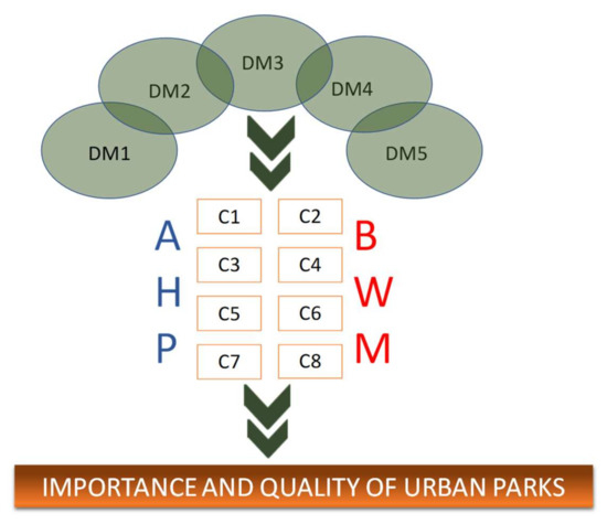 The first step in assessing the quality of the criteria when evaluating the urban parks was to identify relevant decision-makers who will select and assess the criteria. To enable a comprehensive approach and diverse views of the problem, members of the group (designated as decision-makers DM1–DM5) were selected from the following areas of professional interest: DM1—urban greenery; DM2—urban forestry; DM3—environmental protection; DM4—landscape design and DM5—cultural and historical heritage. The aim of including the above-listed decision-makers was to provide an objective insight to the analyzed problem, taking into account different perspectives.