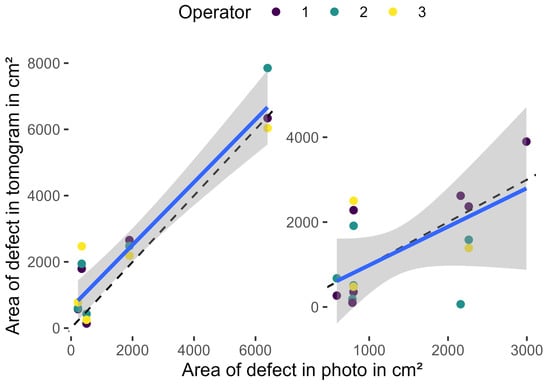 Correlation of defect in tomograms and images of stem cross-sections (left: site PA2, operators used the same nails; right: site AP, operators used different nails at new locations). Dashed line indicates 1:1. Gray: 95% confidence interval.