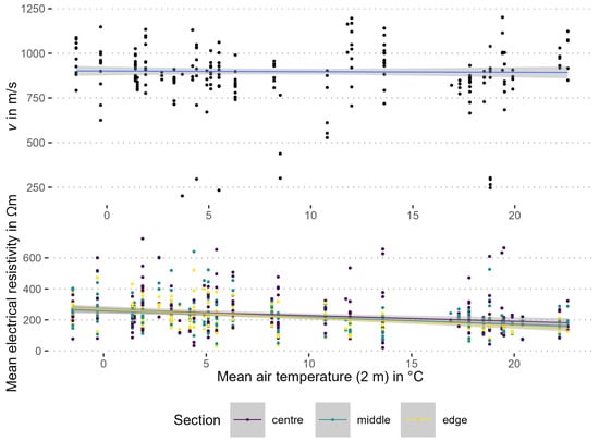 and ERT based on it were less repeatable than v and SoT. Most likely, varying wood moisture and temperature contributed to this difference. Temperature changes affected well above 0 °C (Figure 5), as has already been reported in earlier studies [,,,,,]. Changing irradiation on the stem, and changing stem and sap temperatures, can all cause variability in at the stem surface and in sap wood. Changes in stem water content during transpiration are a further source of variation [], although they are unlikely to affect tomograms of urban trees visibly. Ref. [] reported 5% variation in the resistivity between successive measurements, somewhat more than the 2% found in the present study. However, centering the data of each tomogram before further processing [] eliminated the correlation with temperature completely (data not shown) and is highly recommended when comparing ERT over time.