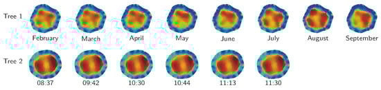 Stem electrical resistivity, on the other hand, changes significantly with temperature [,] and seasonally changing resistivity has been described for Fagus sylvatica by [], who found different pattern of change in sap wood and heart wood. Similarly, wood moisture content has a significant effect on and resulting tomograms [,].