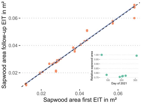 Sapwood area of 20 spruce trees measured several times in 2021 (site PA1, including only measurements with Picus TreeTronic). Inset shows variation of sapwood area in one individual tree with the largest changes in the sample. Blue: Linear Regression, gray: 95% confidence interval, dashed: 1:1.