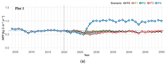 Model predicted site-level averaged net primary productivity [NPP, kg C m−2 year−1] before and after shade-tolerant broadleaved species invasion (i.e., PFT4) and subsequent salvage logging under the F4 scenario in Plot 1, Plot 2, and Plot 3 in the future.