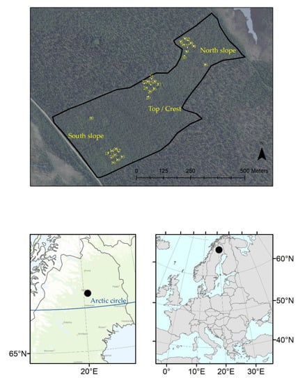 The study was conducted at Gällivare in Sweden, about 100 km north of the Arctic Circle (Figure 1). The experiment was established in 1987 to study “whether survival and growth differ between seedlings planted on differently facing slopes, aspects of a mountain with harsh boreal climate”. Three aspect-slopes (hereafter called A-S) were used in the experiment: the southwest slope (hereafter called SW), northeast slope (hereafter called NE), and the crest of the mountain Peltovaara (hereafter called Top). The mountain Peltovaara is situated at latitude 67°05′ N and longitude 20°22′ E, with an altitude between 476 and 478 m above sea level (a.s.l). SW and NE range from 444 to 456 m a.s.l. [13]. The degree of slope at SW and NE ranged from 5 to 10%, and was 0% at the Top [13]. The region has a cold climate because of its relatively high latitude. The mean daily temperature ranges from −13.1 °C in January to 14.7 °C in July; and in summer, the temperature can occasionally rise above 30 °C [23].