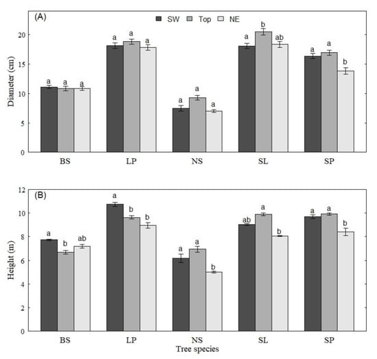 Comparison of the mean diameter (A, upper panel) and height (B, lower panel) of the dominant trees of black spruce (BS), lodgepole pine (LP), Norway spruce (NS), Siberian larch (SL) and Scots pine (SP) on the southwest slope (SW) mountaintop (Top) and northeast slope (NE). Means with the same letter are not significantly different (p < 0.05).