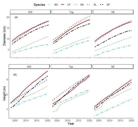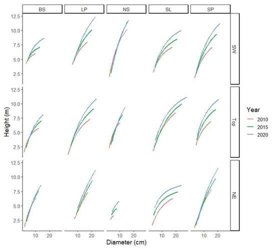 The shift in the height–diameter curves of the species in the last decade varied, especially on NE (Figure 4). NS had little difference between the years for SW and Top, whereas other species had little difference in NE but larger differences in Top and SW. SL had different height curves in all three aspects.
