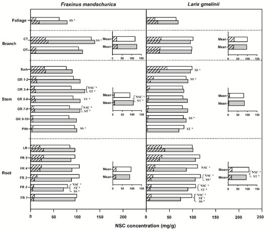 Non-structural carbohydrates (NSC), soluble sugar (SS) and starch (ST) concentrations for compartments from organs (foliage, branch, stem and roots) of Fraxinus mandschurica and Larix gmelinii plantations in control and N fertilization plots. Inset: Mean values of NSC, SS and ST concentrations within an organ across compartments in control and N fertilization treatments. Bars in white and in grey represent the control and N fertilization, respectively. For the same bar, the left shading part and the right blank part represent SS and ST concentrations, respectively. CT, current-year twig; OT, one-year-old twig; GR, growth ring; LR, large root; FR, fine root branching order. “*” behind “NSC”, “SS” or “ST” within a compartment indicates significant (p < 0.05) differences of this chemical trait between control and N fertilization treatments.