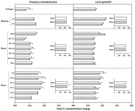 Total carbon (C) concentrations for compartments from organs (foliage, branch, stem and roots) in Fraxinus mandschurica and Larix gmelinii in control (white bar) and N fertilization (grey bar) plots. Inset: Mean values of C concentration within an organ across compartments in control and N fertilization treatments. CT, current-year twig; OT, one-year-old twig; GR, growth ring; LR, large root; FR, fine root branching order. “*” within a compartment indicates significant (p < 0.05) differences between control and N fertilization treatments.