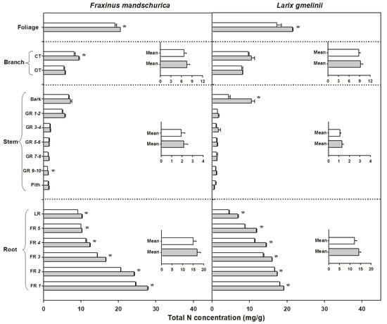 Total nitrogen (N) concentrations for compartments from organs (foliage, branch, stem and roots) in Fraxinus mandschurica and Larix gmelinii in control (white bar) and N fertilization (grey bar) plots. Inset: Mean values of N concentration within an organ across compartments in control and N fertilization treatments. CT, current-year twig; OT, one-year-old twig; GR, growth ring; LR, large root; FR, fine root branching order. “*” within a compartment indicates significant (p < 0.05) differences between control and N fertilization treatments.
