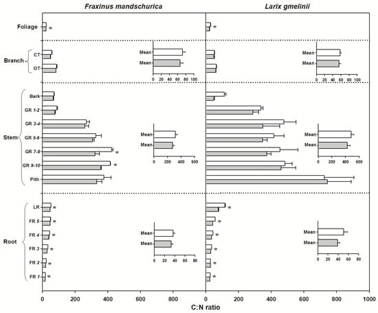 C:N ratio for compartments from organs (foliage, branch, stem and roots) in Fraxinus mandschurica and Larix gmelinii in control (white bar) and N fertilization (grey bar) plots. Inset: Mean values of C:N ratio within an organ across compartments in control and N fertilization treatments. CT, current-year twig; OT, one-year-old twig; GR, growth ring; LR, large root; FR, fine root branching order. “*” within a compartment indicates significant (p < 0.05) differences between control and N fertilization treatments.