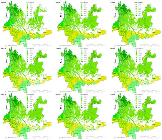 Under the T00P00 scenario, the entire forest area in Yunnan Province increased by 130.42% compared with the current forest vegetation distribution area [23]. Overall, when the temperature increased by 1 °C, the distribution area of the 7 forest vegetation types initially increased, and then decreased as the precipitation decreased; however, when the precipitation decreased by 30%, an increase in the distribution area of 4.62% was observed. When the temperature increased by 2 °C and precipitation decreased by 10, 20, and 30%, the distribution area of the 7 forest vegetation types decreased by approximately 10%. In response to an extreme environment where the temperature increases by 2 °C and precipitation decreases by 30%, the distribution area of the primary forest vegetation increased by 3.46% in Yunnan Province. For each forest vegetation type, as the temperature increased and the precipitation decreased, the distribution area of the seven forest vegetation types (except WTC) decreased to varying extents (Table 3 and Table 4). However, the distribution area of the WTC type increased by approximately 30% in all of the simulation scenarios. In response to a temperature increase of 1 °C and a precipitation decrease of 20%, the distribution area of the WHC forest decreased significantly (59.76%); although, in the other precipitation decrease scenarios, the distribution area decreased by only approximately 4.50–6.50%. When the temperature increased by 2 °C, the distribution area of the WHC forests decreased greatly (Table 3 and Table 4) under the different precipitation decrease scenarios (except for the T02P30 scenario). Under the T02P30 scenario, the distribution area of the WHC decreased by 6.28%, which was smaller than the decreases observed under the other simulation scenarios, and the entire distribution area increased under this scenario (Figure 1).