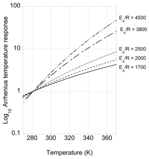 The Arrhenius temperature response function (Equation (2)) describes how an increase in temperature is expected to drive an increase in the mineral dissolution rates. The responses are shown for selected activation energies in Figure 1.