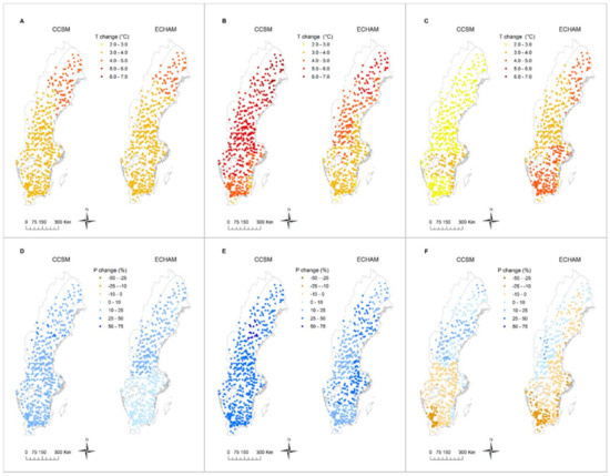 Differences in air temperature (T) and precipitation (P) between climate change projections by the CCSM and ECHAM models for the period 2071–2100 as compared to a hypothetical future with no change from the reference period of 1981–2010 (adapted from [35]). The upper row shows: (A)—the difference in mean annual temperature (°C), (B)—mean winter temperature (°C) and (C)—mean summer temperature (°C). The lower row shows the corresponding difference in precipitation (%) annually (D), for the winter season (E) and for summer (F).