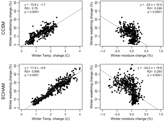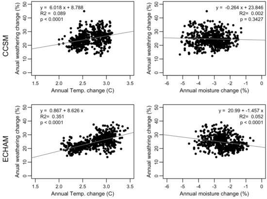 The effect of the change in annual average soil moisture on the weathering rates seems inconclusive (Figure 5). Under the CCSM climate scenario, the correlation between the increase in average annual weathering and the decrease in average annual moisture is not significant, weak, and has a wide spread. Under the ECHAM climate scenario, although the correlation is significant, it has a wide spread and a weak slope (Figure 5).