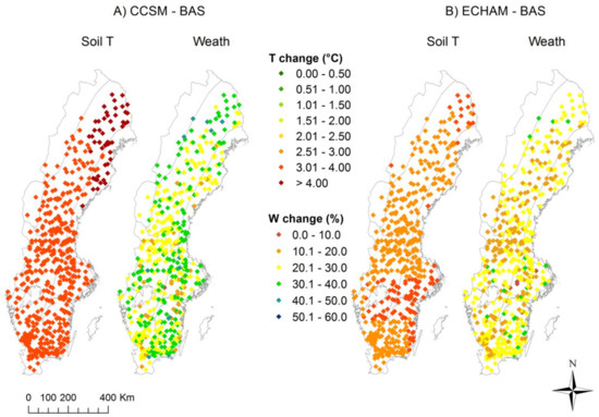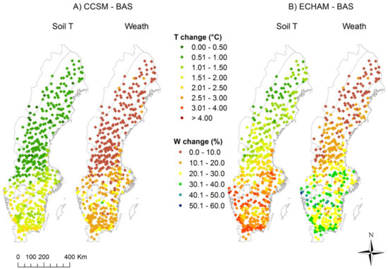 Differences in summer soil temperatures and weathering rates according to (A)—CCSM climate projections and (B)—ECHAM climate projections.
