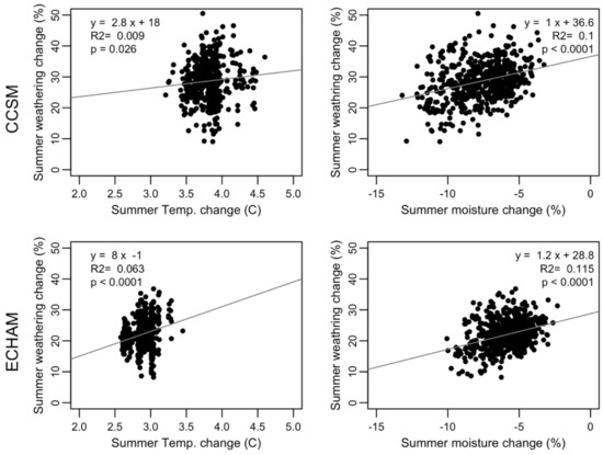 Unlike the change in annual soil temperatures shown above, the increase in summer soil temperatures is different between the two climate scenarios (Figure 6). Summer soil temperatures are expected to increase by 3.5 °C to 4.5 °C according to CCSM, but only by 2.5 °C to 3.5 °C according to ECHAM. Yet, although summer soil temperatures would increase the most under CCSM, weathering rates do not follow suite as expected. The effect of the increase in summer soil temperatures on weathering is only significant under the ECHAM scenario, with a substantial slope of the linear regression between the increase in weathering rate and that in soil temperature of 8%·°C−1, but still with a wide spread reflected in the low R2 of 0.06. Under CCSM, the correlation between soil temperature change and the change in weathering is not significant.