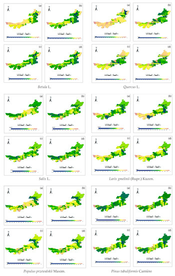 Map (a) refers to the initial planting of the seedlings of the corresponding tree species, and (b) shows young forests. Maps (c) and (d) depict mature forests. According to these grid data maps, the forest density in Inner Mongolia is regulated by tree species and diameter steps, which can be used as references for forest management by the Inner Mongolia Forest Department. This finding has strong practical significance for considering new afforestation, felling control, forest management, and failed afforestation sites [48,49,50].
