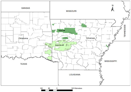 Map showing the 196 out of 208 permanent plot locations of the natural even-aged Shortleaf pine (Pinus echinata Mill.) stand in Ozark (35) and Ouachita National Forest (161). The black dot in the map gives a general idea of plot locations but does not provide a precise location due to the clustering of circular plots at 36.3 m (120 ft.) apart with buffer strips in one site. The geographic location of 12 plots was missing.