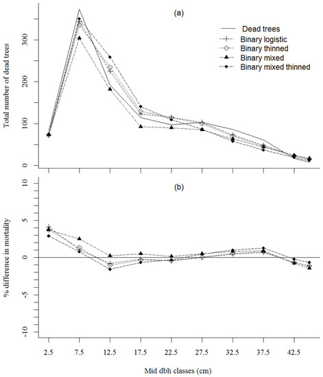 Both the binary logistic model and binary thinned model showed better fit in terms of mortality curve with the observed mortality than for the mixed-effects models (Figure 2a). The percentage difference in observed and predicted mortality for each mid-dbh class showed that the binary logistic model provided a marginally better fit in predicting mortality than the binary thinned model (Figure 2b and Table 6). In the mixed-effects model approach, the binary mixed model appeared to have greater percentage differences in mortality prediction than binary mixed thinned (Figure 2b). All models (Equations (3)–(6)) under predicted mortality for mid-dbh classes at 2.5 cm and 7.5 cm, respectively (Figure 2b and Table 6). The total number of predicted mortality trees was nine trees greater than observed dead trees for the binary logistic model, and it was eight trees greater than observed for the binary thinned model (Table 6). However, the total number of predicted mortality trees was 161 trees less than the observed dead trees for the binary mixed model, but 15 trees greater for the binary mixed thinned model (Table 6).