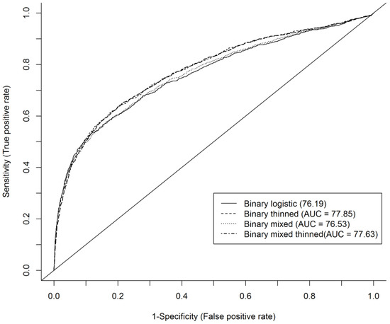 Examination of the ROC curve showed that the area under the curve (AUC) for the models with thinning effect (Equations (4) and (6)) were better than in the models without the thinning effect (Figure 3). Figure 3 indicates that the mixed-effects model without thinning effects was slightly better than the binary model without thinning effects. However, the binary model with thinning effects was slightly better according to the AUC criterion than the mixed-effects model with thinning effects, and was the best model by a small margin according to the AUC criterion. The AUC of all models indicated that the model has a reasonably good ability to discriminate the mortality risk of an even-aged individual shortleaf pine tree growing in a natural forest stand.