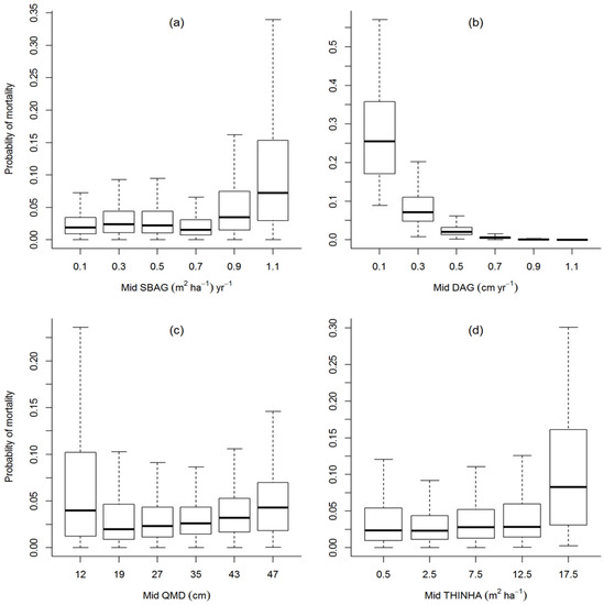 Box plot showing the predicted probability of mortality against the variables; (a) SBAG, (b) DAG, (c) QMD, and (d) THINHA, used in the model at their mid-class ranges. The boxplot for variable ‘THINHA ‘was plotted from the parameter estimates of binary thinned (Equation (4)), while other boxplots were plotted from the parameter estimates of the binary logistic model (Equation (3)).