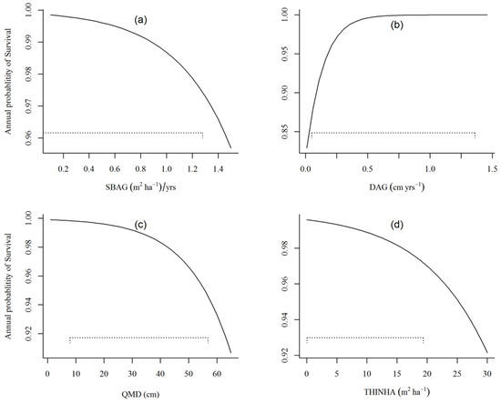 Influence of a variable in predicting annual survival probability while fixing all other independent variables; (a) SBAG, (b) DAG, (c) QMD, and (d) THINHA, as constant equal to their data means. The plot for THINHA was plotted using parameter estimates of binary thinned (Equation (4)), while other plots were plotted using parameter estimates of binary logistic (Equation (3)).