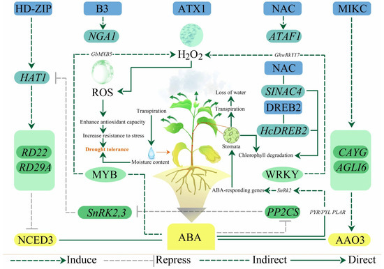 - Sato, H.; Takasaki, H.; Takahashi, F.; Suzuki, T.; Iuchi, S.; Mitsuda, N.; Ohme-Takagi, M.; Ikeda, M.; Seo, M.; Yamaguchi-Shinozaki, K. Arabidopsis thaliana NGATHA1 transcription factor induces ABA biosynthesis by activating NCED3 gene during dehydration stress. Proc. Natl. Acad. Sci. USA 2018, 115, E11178–E11187. [Google Scholar] [CrossRef] [PubMed]
