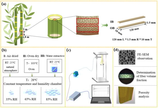Samples preparation for bamboo properties test and characterization under different statuses. (a) Schematic of the standard sample preparation; (b) relative humidity treatment under three conditions; (c) device for testing the acoustic vibration characteristic via the resonance method; (d) field emission scanning electron microscopy observation, determination of fiber volume fraction, and porosity analysis by μ-CT.