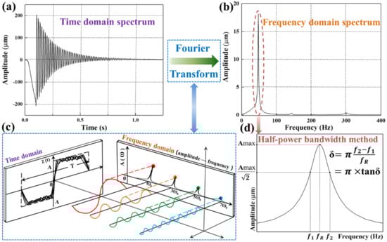 Schematic of Fourier transform with the time-domain signal to the frequency-domain signal and the principle of the half-power bandwidth method. (a) Time-domain spectrum; (b) frequency-domain spectrum; (c) Fourier transform; (d) half-power bandwidth method.