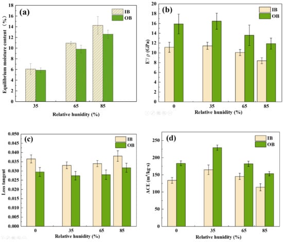 The IB and OB after water extraction were adjusted to a stable MC at different 3 RH levels: 35%, 65%, and 85% (the temperature was set to 20 °C). The resultant /, tan, and ACE values of the samples under three statuses are shown in Figure 11. As shown in the figure, the bamboo subjected to water extraction (status III) for 1 week had the highest / and ACE and the lowest tan, among the three types of bamboo samples. The bamboo under status III showed increases of 0.4%–5.6% in / and 30.8%–64.5% in ACE and a decrease of 3.1%–19.5% in tan, relative to those of bamboo under status I.