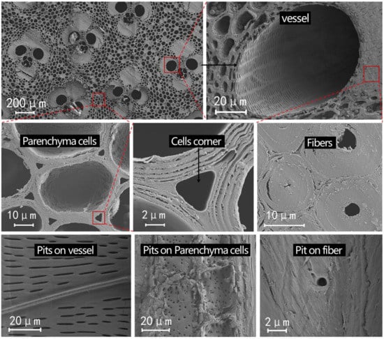 Scanning electron microscopy (SEM) images of the partial pore structure of bamboo.