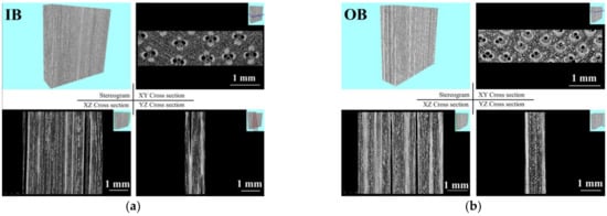 Three-dimensional (3D) micro-CT images of the inner (IB) and outer (OB) bamboos. Stereogram and the XZ, XY, and YZ cross-sectional views of IB (a) and OB (b); (c,d) 3D reconstruction images (yellow) and pore distribution (green) of IB and OB, respectively.