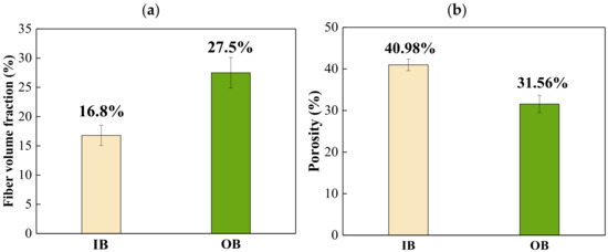 Fiber volume fractions (a) and porosities (b) of IB and OB.