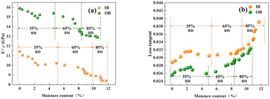 Under the stable relative humidity and hygroscopic condition, the stable MC of the IB and OB at stable 35% RH were 6.08% and 5.86%, respectively. The samples in this state reached the maximum / and ACE and minimum tan, consistent with previous studies. When the MC was about 6.5% (±1.7%), the loss tangent reached the minimum value. It then exhibited an overall linear increase with increasing water content until the MC reached about 20%. The increase in the rate of tan as the MC increased slowed down. / presented the opposite trend; meanwhile, the minimum tan and the maximum / have very close corresponding MC [,,,].