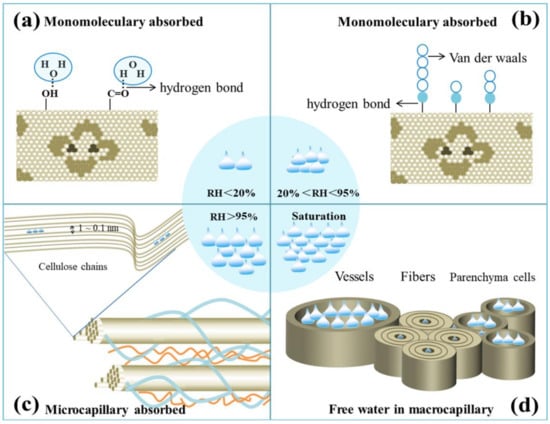 Wei et al. [] used dynamic water vapor sorption combined with the H-H model (Figure 8) to explore the moisture absorption mechanism of bamboo. The results indicated that the increase in MC (<4%) at low relative humidity levels (RH < 20%) was mainly attributable to the monolayer on the primary active sites (Figure 9a). With an increase in relative humidity (20% < RH < 95%), the multilayer absorbed on secondary sites by hydrogen bonding or van der Waals forces began to dominate the adsorption process, especially when RH > 60% (Figure 9b). At 35% RH, the moisture content of the monolayer was exactly close to the saturation state. The moisture content of bamboo was almost entirely attributable to the multilayer adsorption, with subsequently increasing RH. Under high relative humidity (RH > 95%), water condensation was generated by the capillary system composed of various pore structures in bamboo, resulting in a rapid increase in MC (Figure 9c,d).