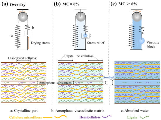 Under the moisture absorption condition of gradually increasing relative humidity, the / and tan of bamboo changed asynchronously with increasing MC, which is consistent with previous studies [,,,]. In the initial state of absolute dryness, the hydroxyl groups on the cellulose molecular chain of the bamboo cell wall formed a tight hydrogen bond, causing the molecular chain to twist and generate drying stress. After being in low relative humidity, the entry of moisture-absorbed water molecules tends to destroy the hydrogen bonding formed between the cellulose molecular chains in the dry state, restoring parts of the hydroxyl groups and absorbing water molecules. This occurrence causes the noncrystalline cellulose and matrix to swell and the cellulose molecules to become stretched and reoriented. Consequently, an instantaneous disturbance of the microfibril angle is generated inner bamboos, which instantaneously increases the internal friction within the internal macromolecular layer, decreasing / and increasing tan [,,,].