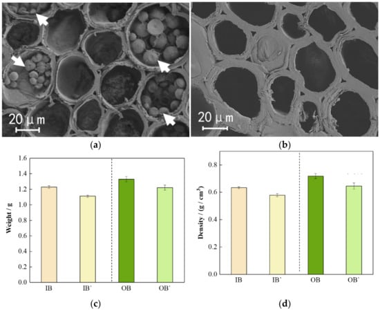 Variations in water-soluble extractives of parenchyma cells ((a) before extraction, (b) after extraction), weight (c) and density (d) of bamboo before (IB and OB) and after (IB′ and OB′) extraction.