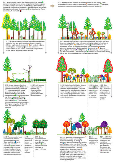 Multipurpose management can be accomplished through the use of one or a combination of the following approaches [154]: (i) simultaneous production of various services and goods in a single forest stand (such as timber, fruit, fiber and medicine in Figure 2 (2.2.6)); (ii) rotational and successive production of different resources in the same stand (such as the gradual replacement of tuber and herb production in Figure 2 (2.1.3) by timber production and understory farming in Figure 2 (2.1.5)); and (iii) geographic segregation of uses across a mosaic of stands in the same landscape (such as exclusive fruit production in Figure 2 (2.1.4) and exclusive forage production in Figure 2 (2.2.8)).