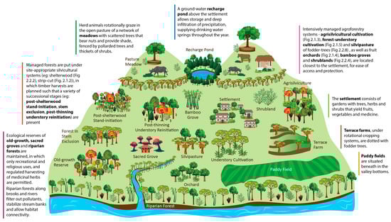 The other concept, ‘integrated landscape management’, refers to the identification and utilization of hydro-ecological linkages and synergies among forest ecosystems, agroecosystems, pastoral ecosystems and aquatic ecosystems, nested in the same landscape (Figure 3) [175]. This concept has only recently gained traction among professional circles [176] because modern chemical-based agriculture has significantly divorced agricultural planning from other land uses [177]. However, many rural communities in Nepal, for centuries, have been synergizing matrixes of farms and forests with patches of settlements, wetlands, shrubland and open meadows, and corridors of riparian forests, streams and roads (Figure 3) (field notes). Nonetheless, forest-level and landscape-level elements of ecological silviculture may be impracticable when community forests face intensive socioeconomic demands or are small and embedded in landscapes that communities do not entirely control. There is an opportunity to manage landscapes through cooperation, such as by allocating state-managed lands, adjacent to intensively managed community forests, as the ecological reserves in the landscape. However, formal landscape-level planning in Nepal, in particular watershed management, has been marred by a lack of meaningful dialogue and engagement among concerned stakeholders [178].