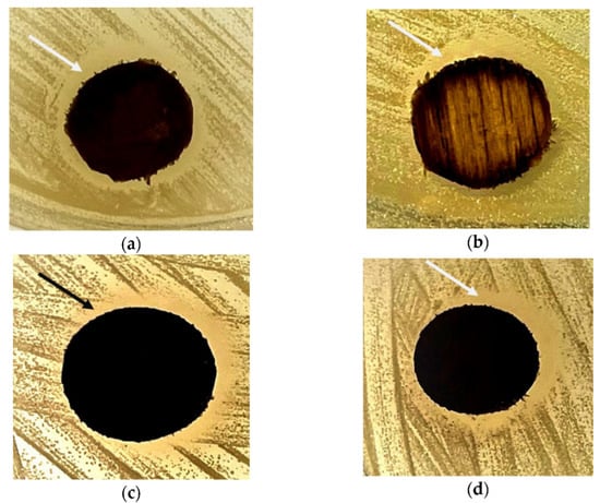 Samples of hardwood discs with inhibition zone (as shown by pointing arrows) after 24 h at 37 °C (a) shining gum—veneer, (b) shining gum—solid, (c) SPG—veneer, and (d) SPG—solid.
