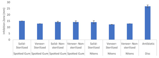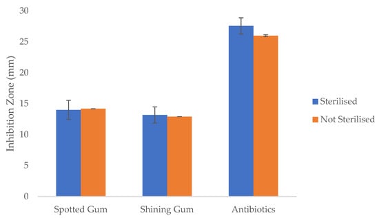 To study the potential effects of sterilisation, a batch of non-sterilised timber samples was included in testing. The results showed that sterilising the samples under gamma irradiation did not have an impact on whether a species, in general, was able to inhibit the growth of the bacteria. However, it did appear to have an effect on resistance to microorganism growth for the number of samples within the first round of tests. This was evident in the non-sterilised shining gum veneer test for S. aureus, where only one of the three repetitions showed an inhibition zone, whereas the same test for sterilised showed three out of three. Considering that there are multiple other reasons for a false positive or negative result, more repetitions are suggested to verify this data in future research. In the later part of this experiment, more repetitions of the test were conducted, and this allowed for the conclusion that sterilisation did not affect the results. The inhibition zone sizes are shown in Figure 5. There was a 1–6% variation in size between the sterilised and the non-sterilised samples. It should also be noted that even though the antibiotic discs were all sterilised, it appears that when they were used in the non-sterilised test the inhibition zones around them were slightly smaller than those in the sterilised test. Over the span of all repetitions, the average zone size of the antibiotic disks was 25.98 mm for the non-sterilised tests and 27.57 mm for the sterilised tests. Given that this is less than a 6% variation in zone size, it was concluded that the antibiotic disc was not affected by the environment (sterilised or non-sterilised) into which it was placed.