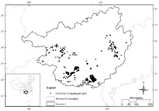 Aside from the publicly available raster data, we also acquire the spatially referenced plot-based National Forest Inventory (NFI). The NFI carries systematic information and records the true productivity in situ, which allows for sound wood-growth estimations and comparisons [,]. Important attributes in the NFI include plot area, site quality, tree age, stem density, diameter at breast height (DBH), height, institutional arrangement and management regimes information (land ownership, tree ownership, etc.). These are essential and complementary to the previous dataset. Moreover, the NFI dataset includes spatially extensive plantation patches, among which 4798 samples are E. urophylla × E. grandis, which is one of the most prevalent eucalyptus species in China. Figure 1 below shows the study area in which the black dot stands for the centroid of UG plot. The large sample size and comprehensive information of NFI allows for accurate assessments of the relationships between timber yields and forest factors. These newly found relationships coupled with the terrain and surface information enable us to determine the spatial extent of eucalyptus plantation and to obtain precise assessments of its condition, growth, volume, etc.